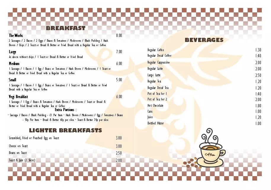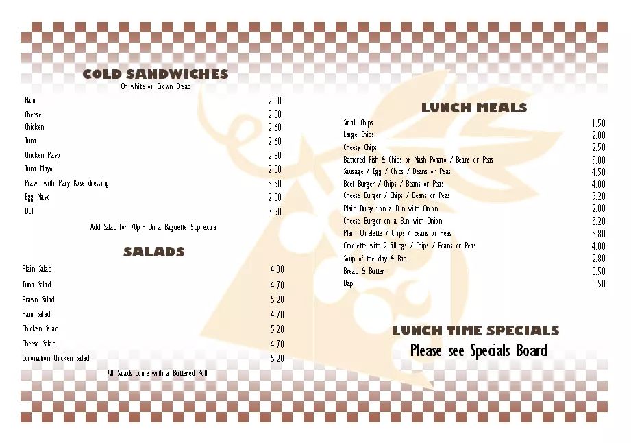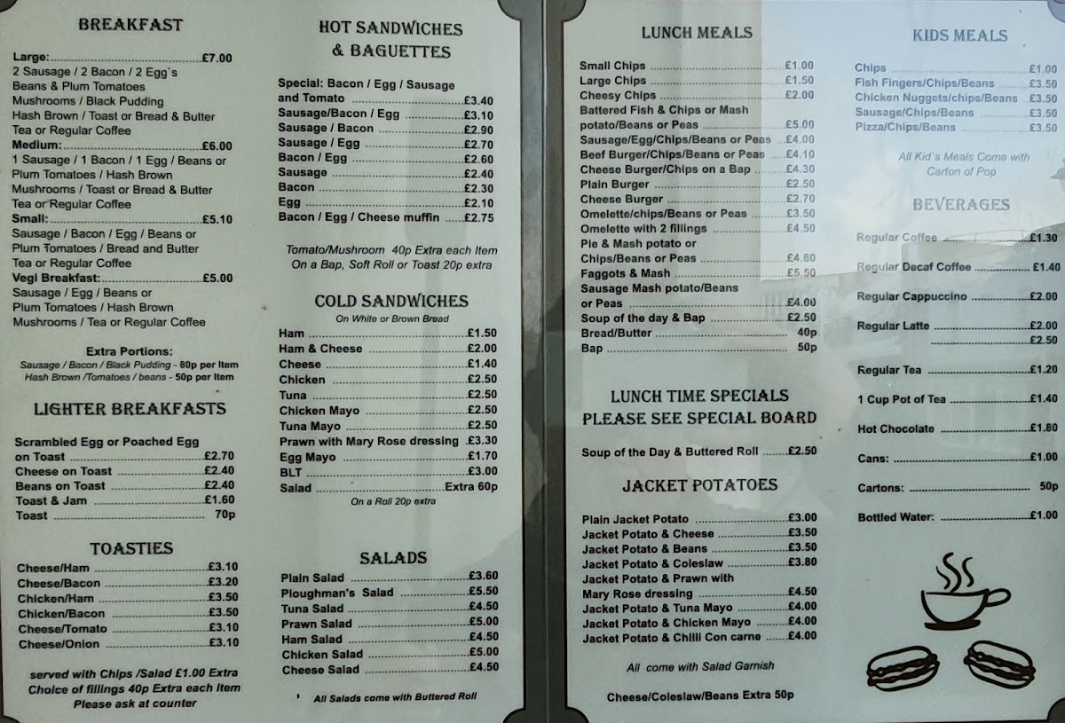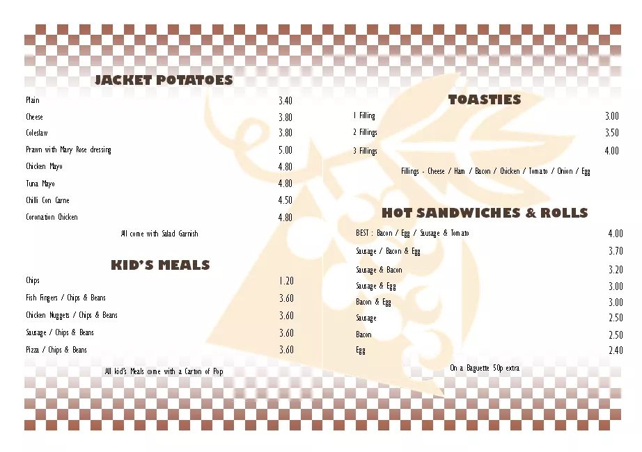 The menu is thoughtfully curated, showcasing a variety of offerings that cater to all appetites. For lunch, the cold sandwiches—like the classic Ham and the fresh Tuna—are a must-try, each crafted with quality ingredients that elevate simple bites into satisfying meals. For those craving something more substantial, the jacket potatoes provide a delightful foundation for a range of toppings. From the cheesy comfort of Jacket Potato & Cheese to the savory richness of Jacket Potato & Chilli Con Carne, there’s something for everyone to indulge in. Breakfast lovers will be thrilled with options such as "The Works," a robust choice that promises to fuel your day.